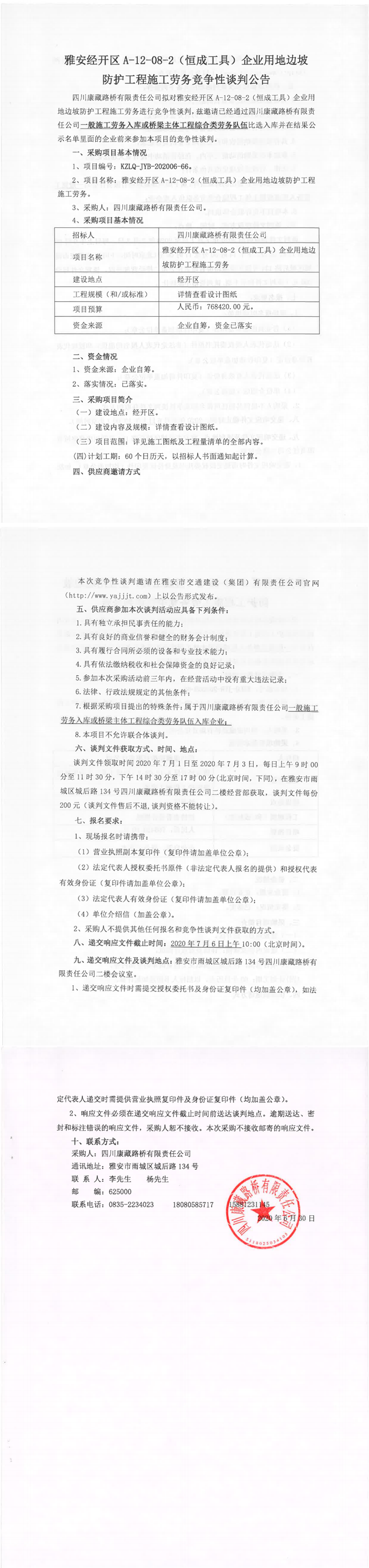 四川康藏路橋有限責(zé)任公司雅安經(jīng)開區(qū)A-12-08-2(恒成工具)企業(yè)用地邊坡防護(hù)工程施工勞務(wù)競爭性談判公告