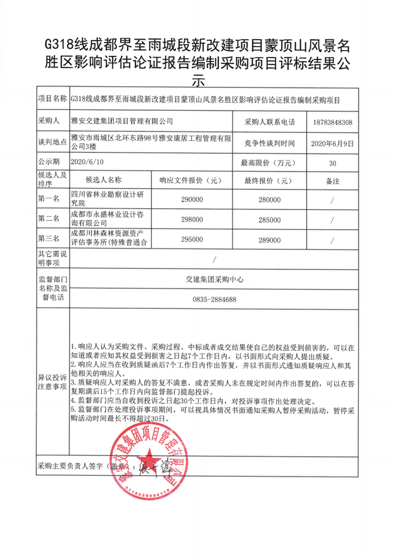 雅安交建集團(tuán)項(xiàng)目管理有限公司G318線成都界至雨城段新改建項(xiàng)目蒙頂山風(fēng)景名勝區(qū)影響評估論證報(bào)告編制采購項(xiàng)目評標(biāo)結(jié)果公示
