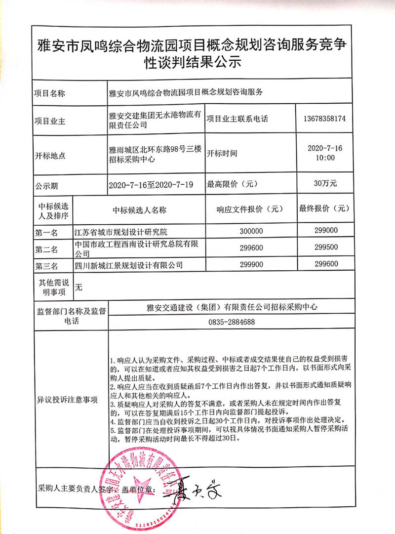 雅安交建集團(tuán)無水港物流有限責(zé)任公司雅安市鳳鳴綜合物流園項(xiàng)目概念規(guī)劃咨詢服務(wù)競(jìng)爭(zhēng)性談判結(jié)果公示