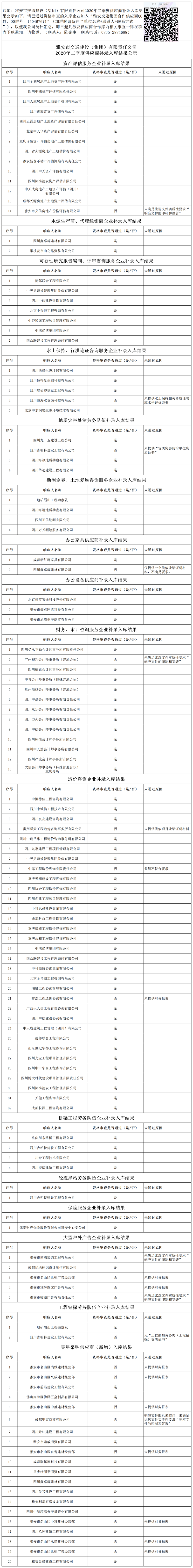 雅安市交通建設(shè)(集團(tuán))有限責(zé)任公司2020年二季度供應(yīng)商補(bǔ)錄入庫結(jié)果公示