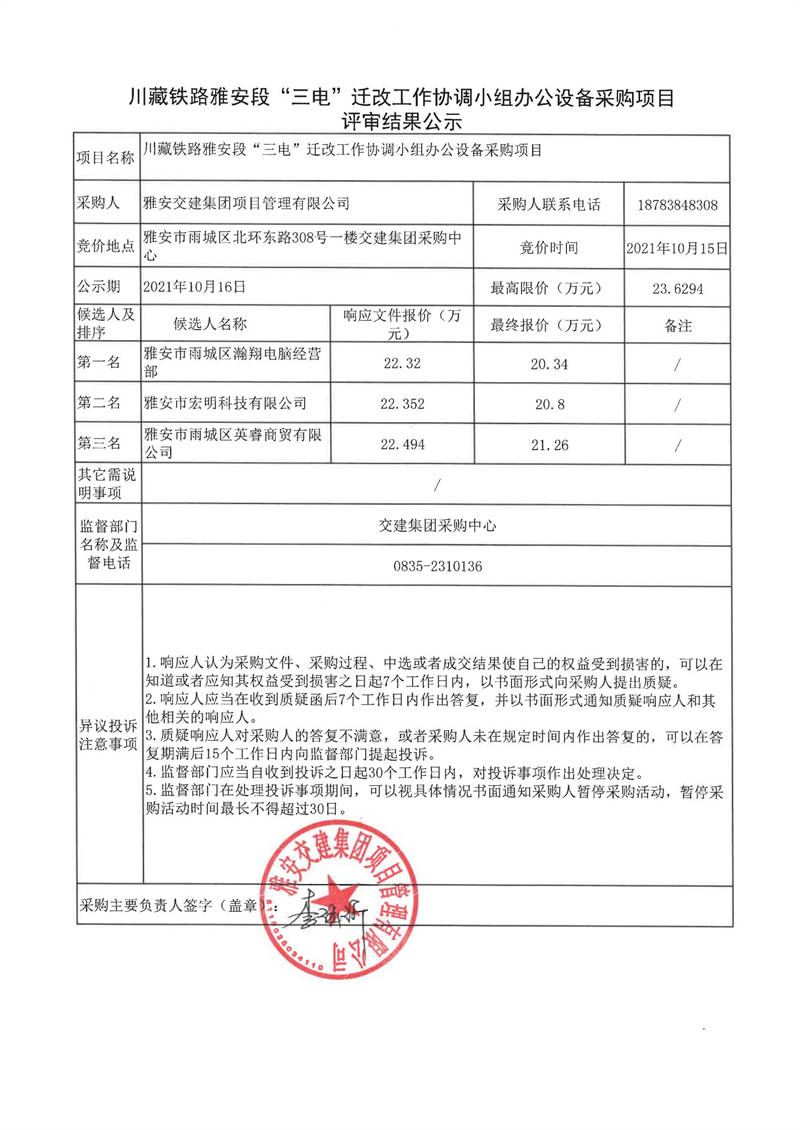雅安交建集團項目管理有限公司川藏鐵路雅安段“三電”遷改工作協(xié)調(diào)小組辦公設備采購項目評審結果公示