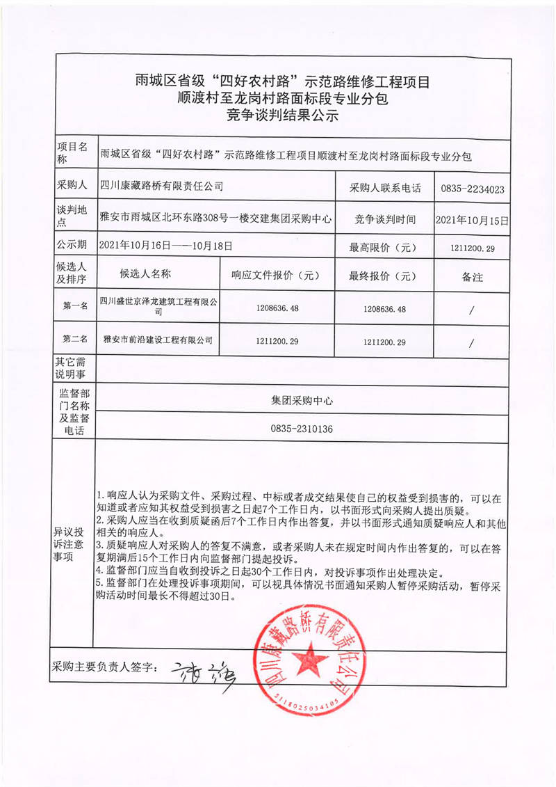 四川康藏路橋有限責(zé)任公司雨城區(qū)省級(jí)“四好農(nóng)村路”示范路維修工程項(xiàng)目順渡村至龍崗村路面標(biāo)段專業(yè)分包競(jìng)爭(zhēng)談判結(jié)果公示