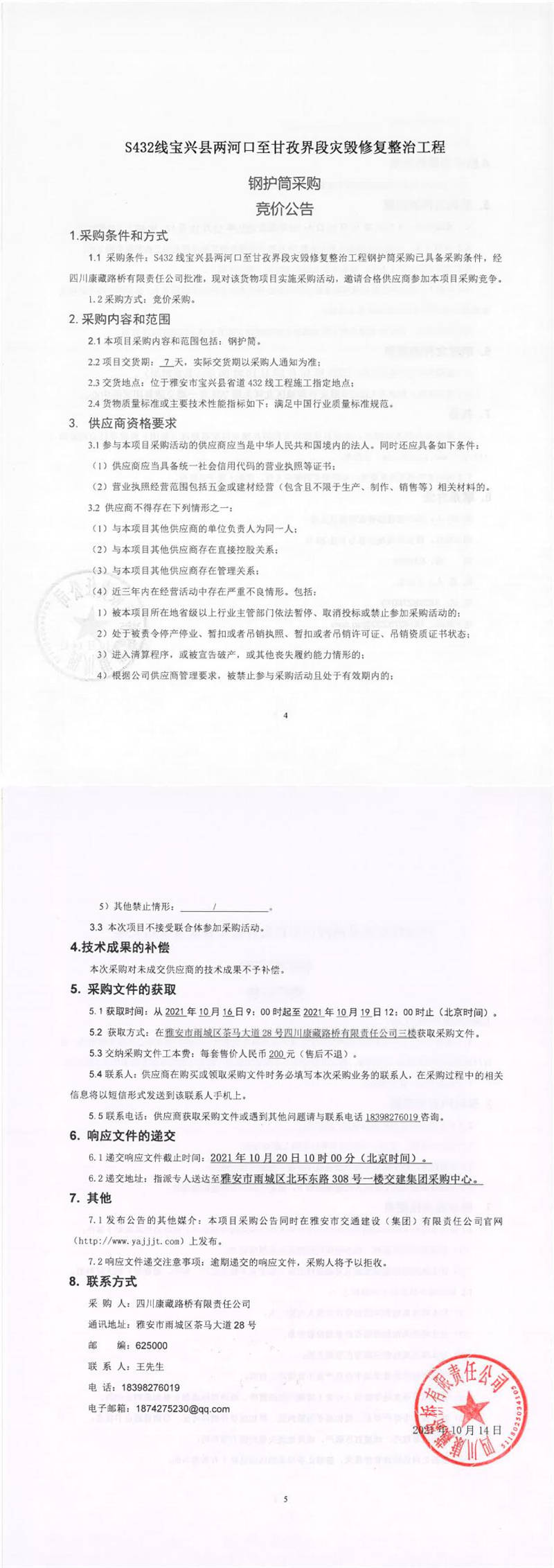 四川康藏路橋有限責(zé)任公司S432線寶興縣兩河口至甘孜界段災(zāi)毀修復(fù)整治工程鋼護(hù)筒采購競價公告