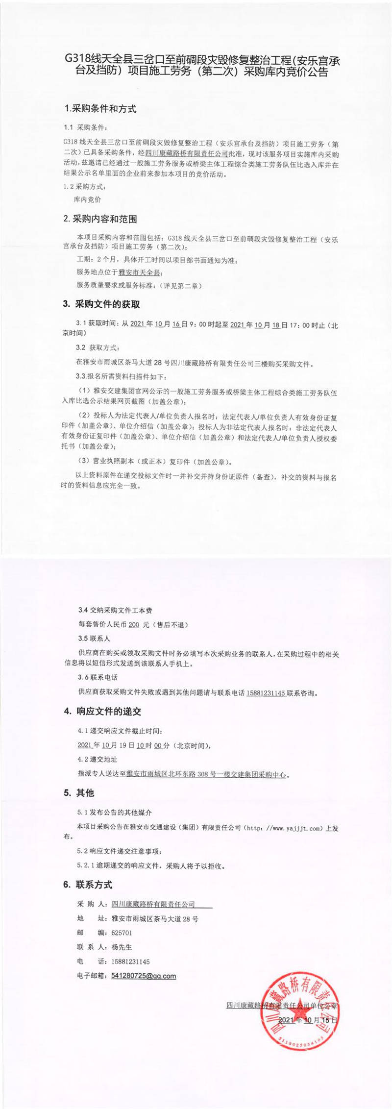 四川康藏路橋有限責(zé)任公司G318線天全縣三岔口至前碉段災(zāi)毀修復(fù)整治工程(安樂(lè)宮承臺(tái)及擋防)項(xiàng)目施工勞務(wù)(第二次)采購(gòu)庫(kù)內(nèi)競(jìng)價(jià)公告