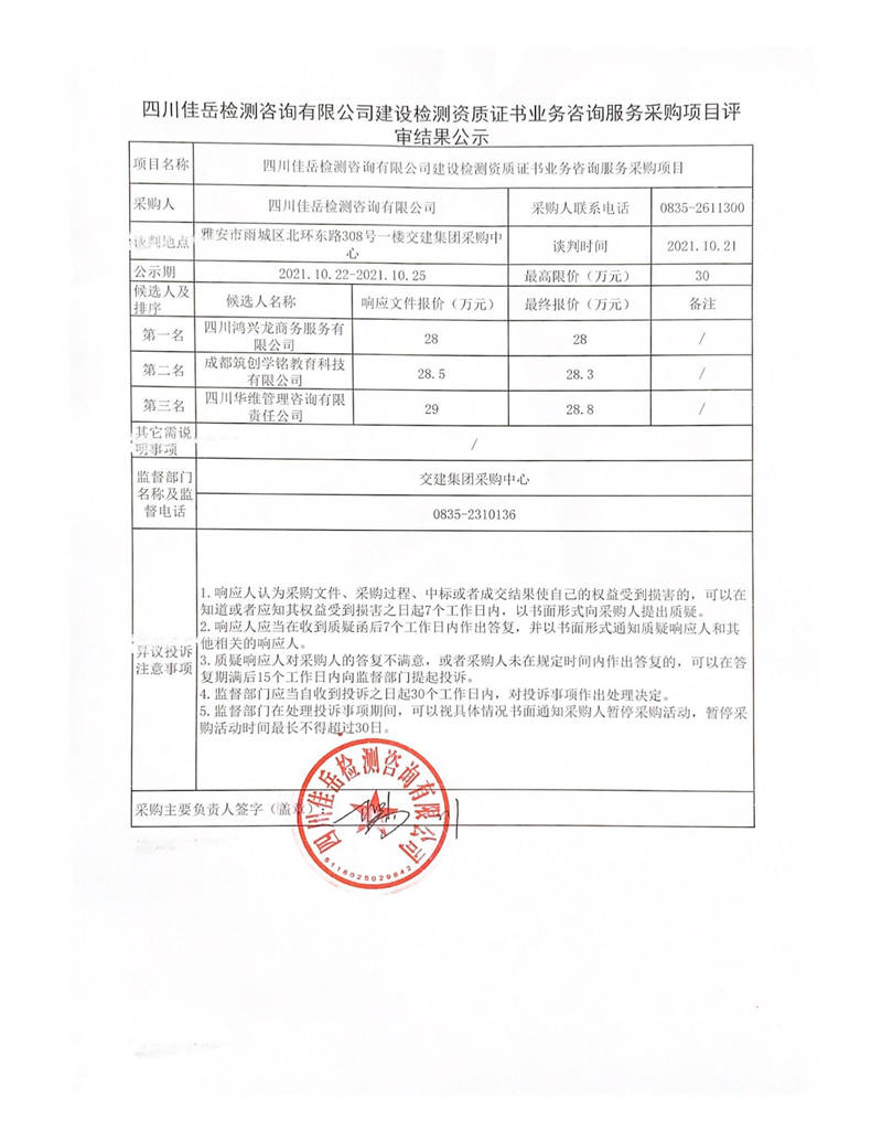 四川佳岳檢測咨詢有限公司建設(shè)檢測資質(zhì)證書業(yè)務(wù)咨詢服務(wù)采購項(xiàng)目評(píng)審結(jié)果公示