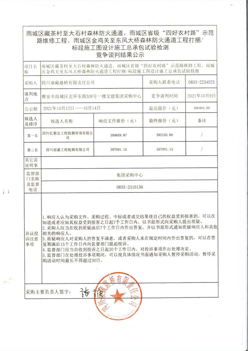 四川康藏路橋有限責(zé)任公司雨城區(qū)藏茶村至大石村森林防火通道、雨城區(qū)省級(jí)“四好農(nóng)村路”示范路維修工程、雨城區(qū)金雞關(guān)至東風(fēng)大橋森林防火通道工程打捆/標(biāo)段施工圖設(shè)計(jì)施工總承包試驗(yàn)檢測(cè)競(jìng)爭(zhēng)談判結(jié)果公示