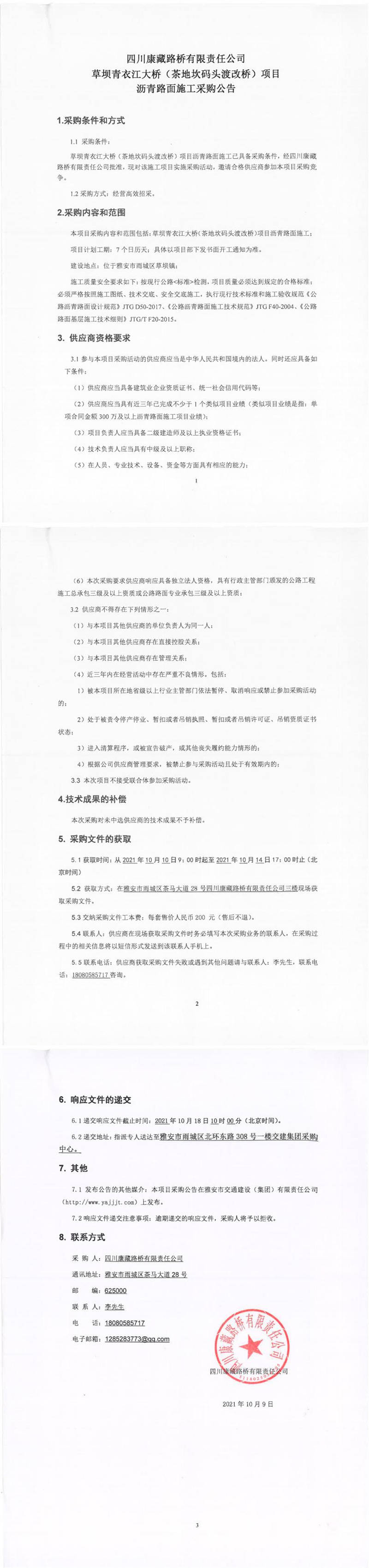 四川康藏路橋有限責(zé)任公司草壩青衣江大橋(茶地坎碼頭渡改橋)項(xiàng)目瀝青路面施工采購(gòu)公告