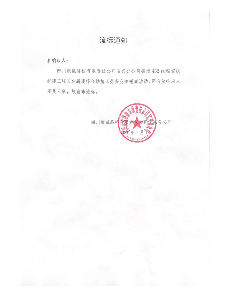 四川康藏路橋有限責任公司寶興分公司省道432線雅安段擴建工程K19新建拌合站施工勞務(wù)競爭磋商流標通知