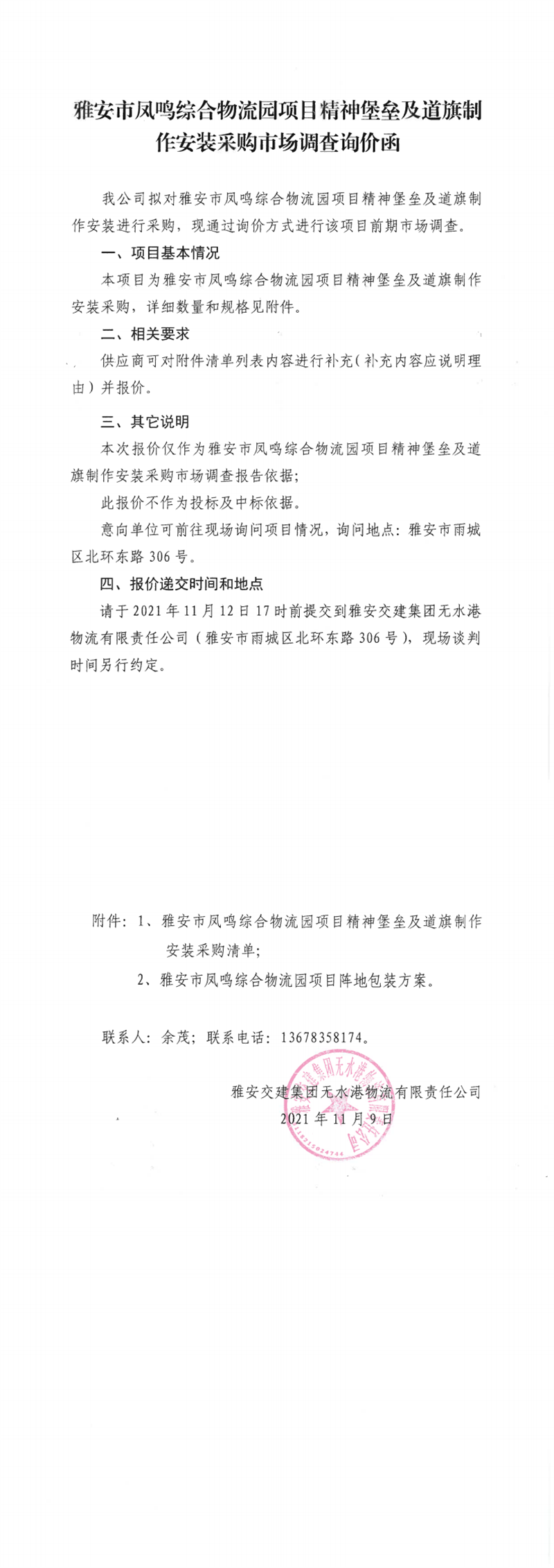 雅安交建集團(tuán)無水港物流有限責(zé)任公司雅安市鳳鳴綜合物流園項目精神堡壘及道旗制作安裝采購市場調(diào)查詢價函