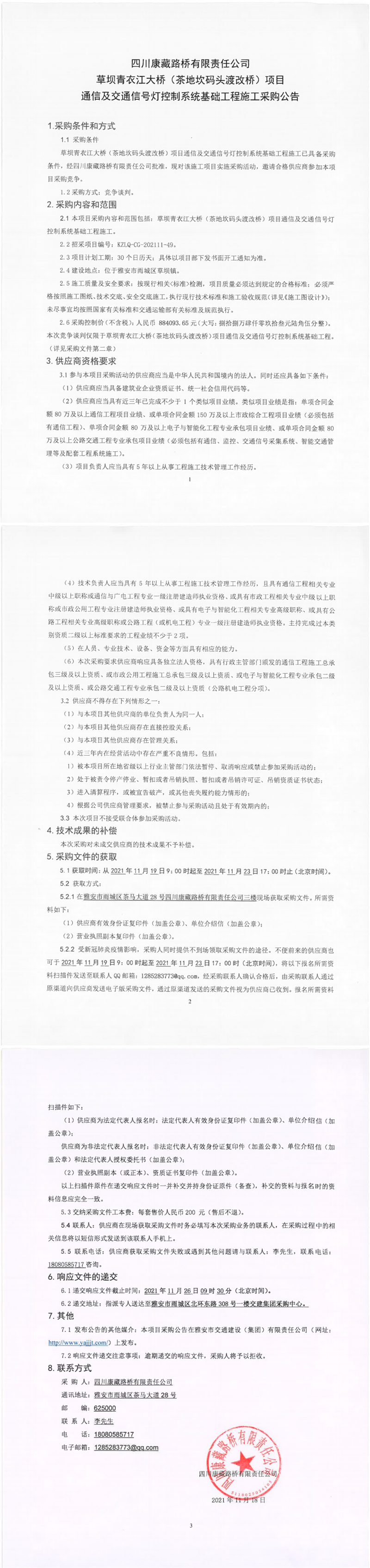四川康藏路橋有限責(zé)任公司草壩青衣江大橋(茶地坎碼頭渡改橋)項(xiàng)目通信及交通信號燈控制系統(tǒng)基礎(chǔ)工程施工采購公告