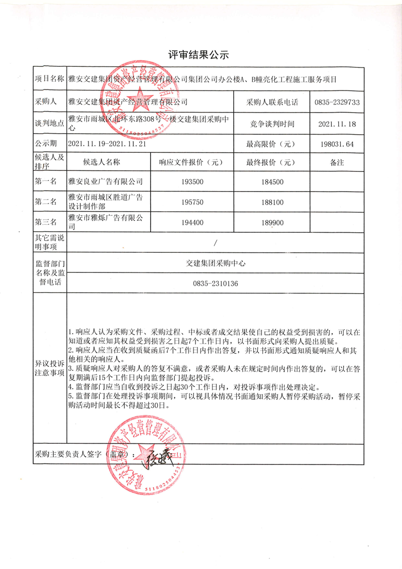 雅安交建集團(tuán)資產(chǎn)經(jīng)營(yíng)管理有限公司集團(tuán)公司辦公樓A、B幢亮化工程施工服務(wù)項(xiàng)目評(píng)審結(jié)果公示