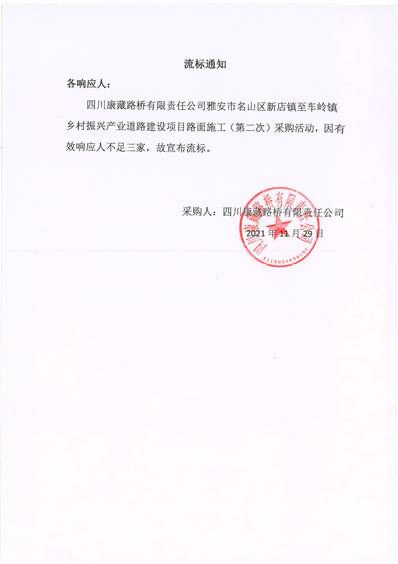 四川康藏路橋有限責任公司雅安市名山區(qū)新店鎮(zhèn)至車嶺鎮(zhèn)鄉(xiāng)村振興產(chǎn)業(yè)道路建設項目路面施工(第二次)流標通知