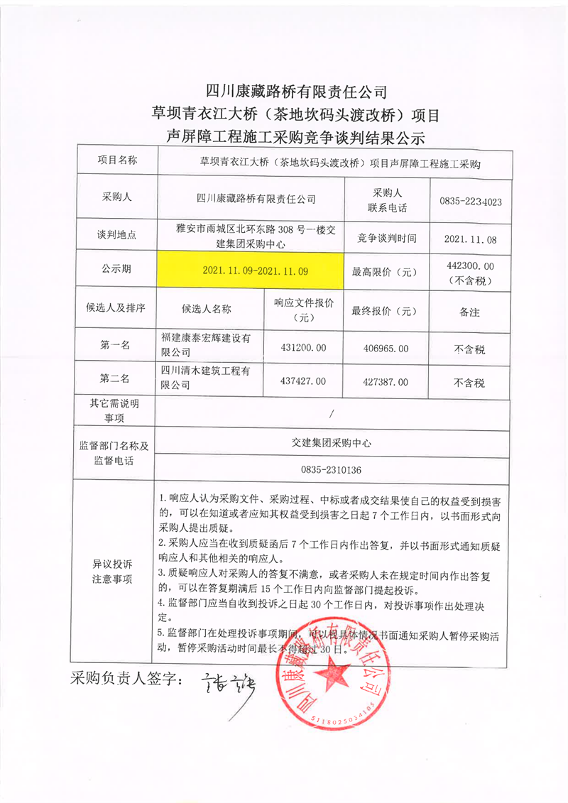 四川康藏路橋有限責(zé)任公司草壩青衣江大橋(茶地坎碼頭渡改橋)項目聲屏障工程施工采購競爭談判結(jié)果公示