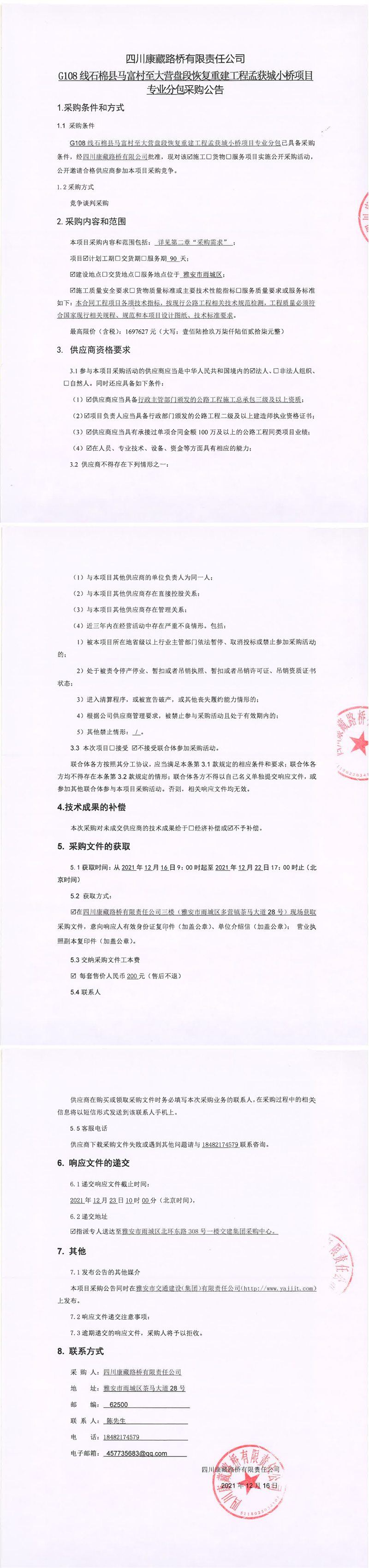四川康藏路橋有限責(zé)任公司G108線(xiàn)石棉縣馬富村至大營(yíng)盤(pán)段恢復(fù)重建工程孟獲城小橋項(xiàng)目專(zhuān)業(yè)分包采購(gòu)公告