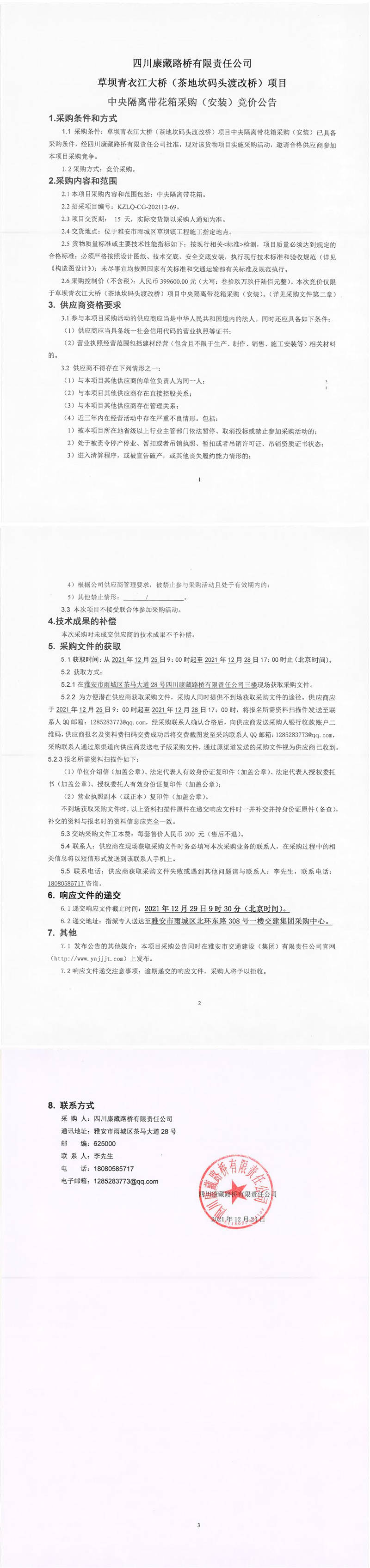 四川康藏路橋有限責(zé)任公司草壩青衣江大橋(茶地坎碼頭渡改橋)項(xiàng)目中央隔離帶花箱采購(安裝)競價(jià)公告