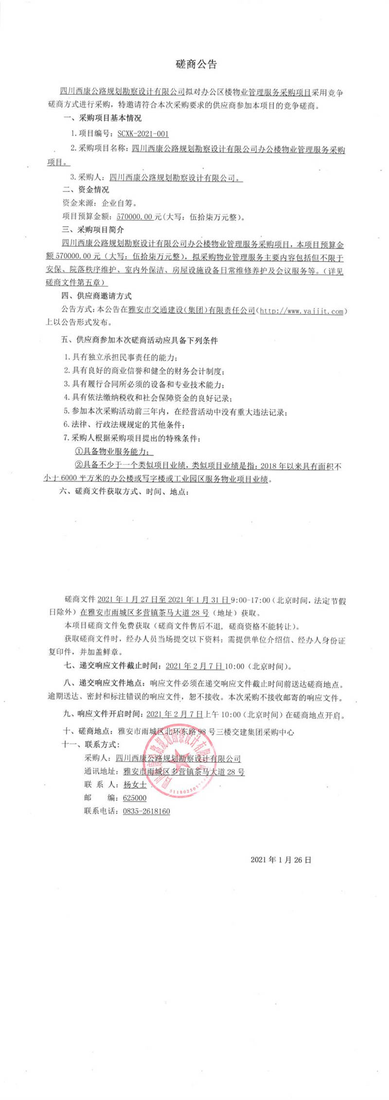 四川西康公路規(guī)劃勘察設(shè)計(jì)有限公司辦公樓物業(yè)管理服務(wù)采購(gòu)項(xiàng)目競(jìng)爭(zhēng)磋商公告