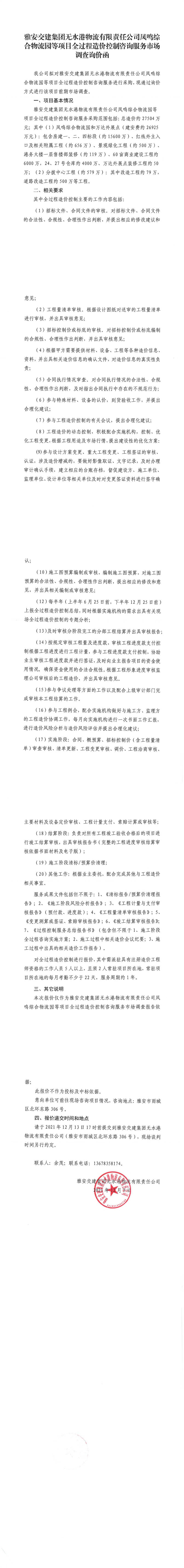 雅安交建集團(tuán)無(wú)水港物流有限責(zé)任公司鳳鳴綜合物流園等項(xiàng)目全過(guò)程造價(jià)控制咨詢服務(wù)市場(chǎng)調(diào)查詢價(jià)函