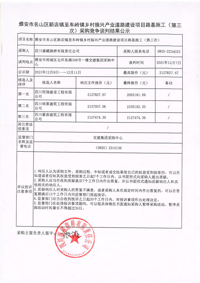 四川康藏路橋有限責任公司雅安市名山區(qū)新店鎮(zhèn)至車嶺鎮(zhèn)鄉(xiāng)村振興產(chǎn)業(yè)道路建設項目路面施工(第三次)采購競爭談判結(jié)果公示