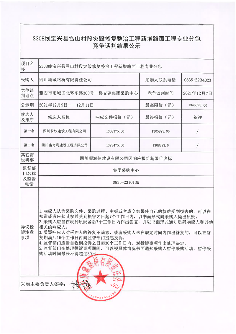 四川康藏路橋有限責(zé)任公司S308線寶興縣雪山村段災(zāi)毀修復(fù)整治工程新增路面工程專業(yè)分包競(jìng)爭(zhēng)談判結(jié)果公示