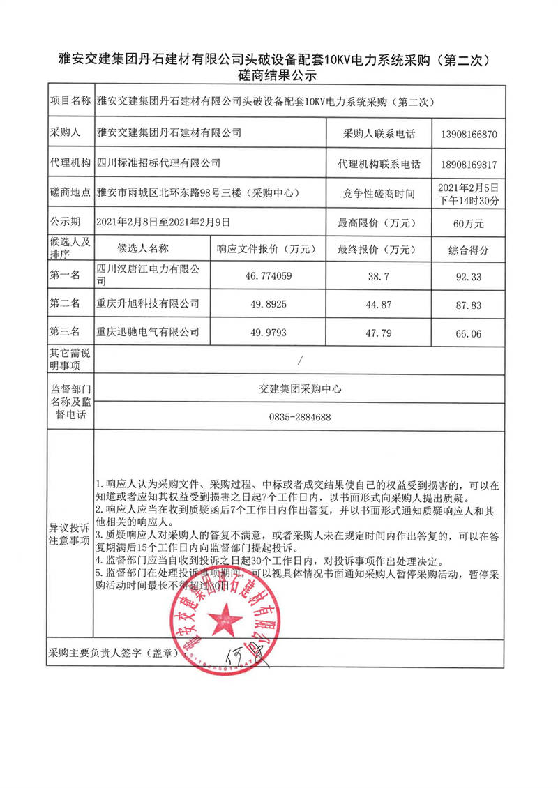 雅安交建集團(tuán)丹石建材有限公司頭破設(shè)備配套10KV電力系統(tǒng)采購(第二次)磋商結(jié)果公示