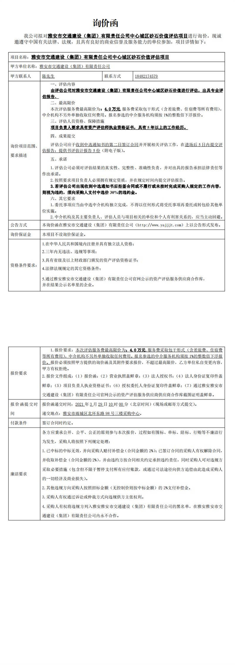 雅安市交通建設(shè)(集團)有限責任公司中心城區(qū)砂石價值評估項目詢價函