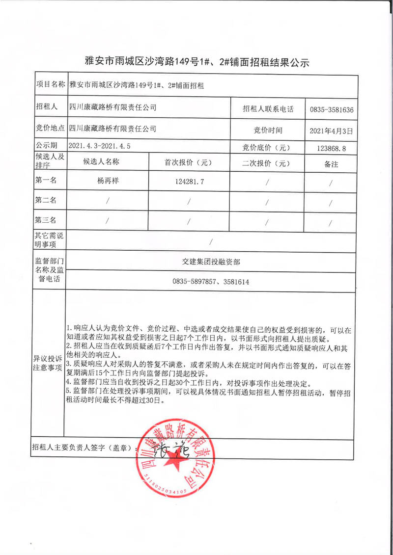 四川康藏路橋有限責任公司雅安市雨城區(qū)沙灣路149號1#、2#鋪面招租結果公示