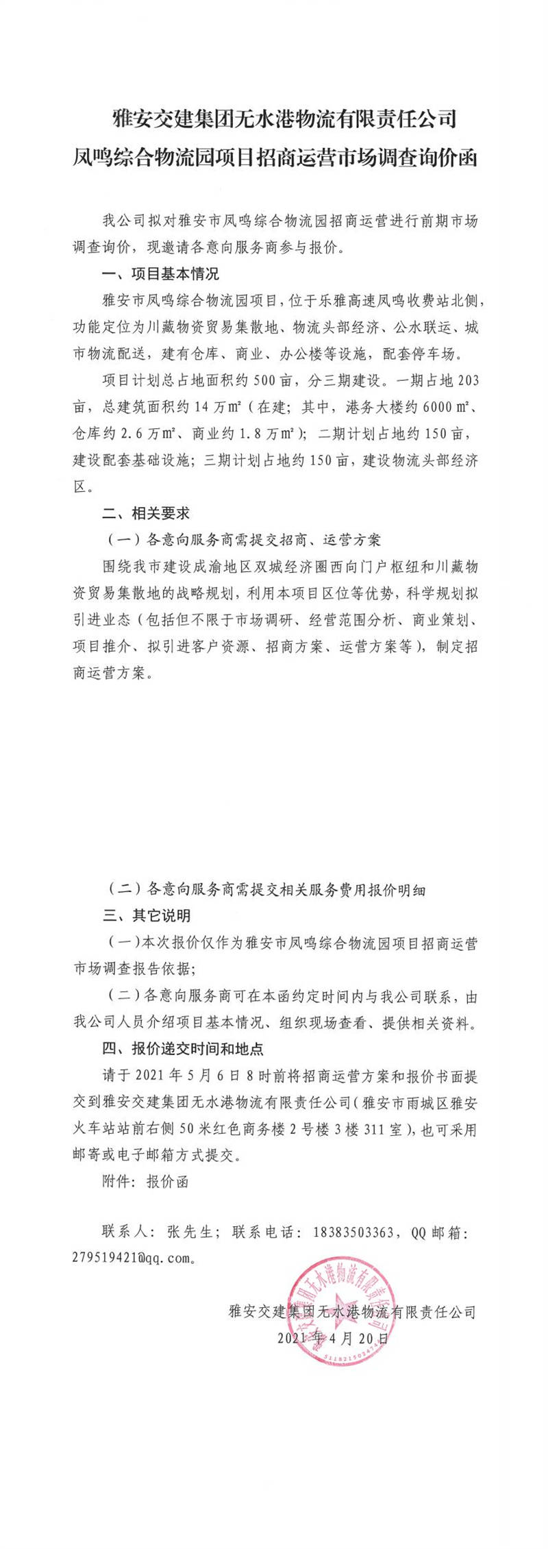 雅安交建集團無水港物流有限責任公司雅安市鳳鳴綜合物流園項目招商運營市場調(diào)查詢價函