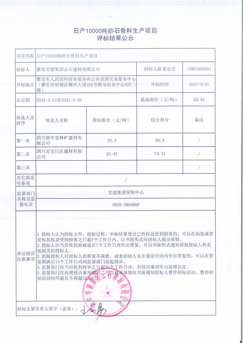 雅安交建集團(tuán)云石建材有限公司日產(chǎn)10000噸砂石骨料生產(chǎn)項(xiàng)目評(píng)標(biāo)結(jié)果公示