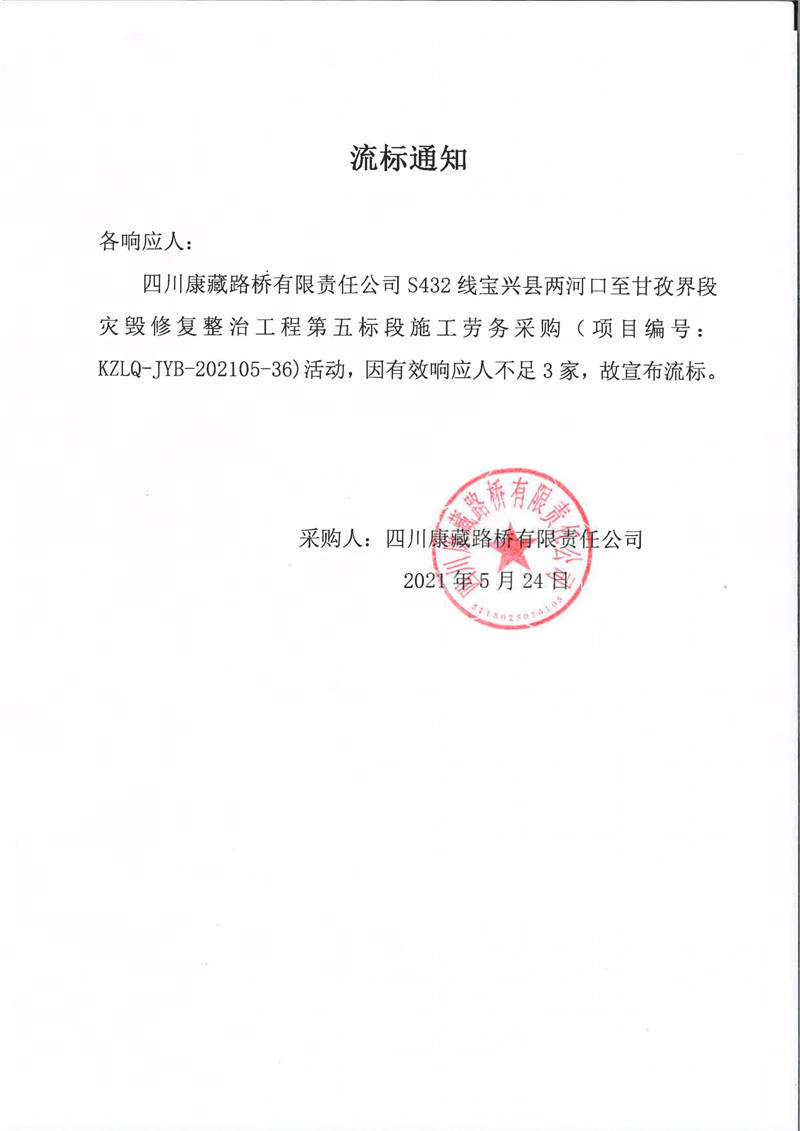 四川康藏路橋有限責(zé)任公司S432線寶興縣兩河口至甘孜界段災(zāi)毀修復(fù)整治工程第五標(biāo)段施工勞務(wù)采購(gòu)流標(biāo)通知