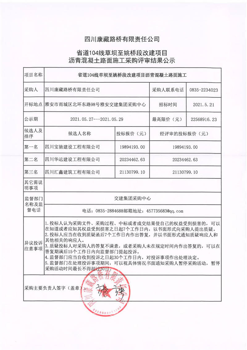 四川康藏路橋有限責(zé)任公司省道104線草壩至姚橋改建項目瀝青混凝土路面施工采購評審結(jié)果公示