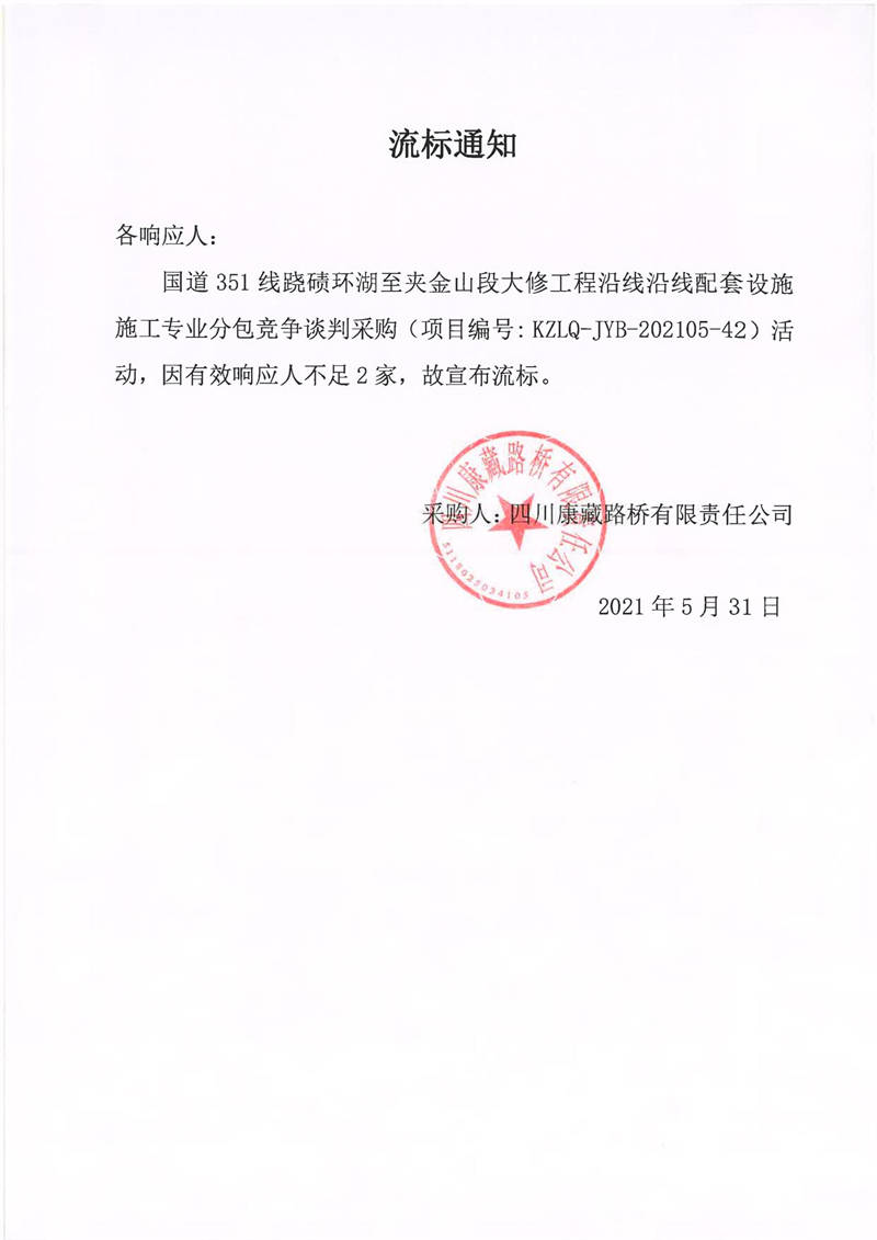 四川康藏路橋有限責任公司國道351線蹺磧環(huán)湖至夾金山段大修工程沿線沿線配套設施施工專業(yè)分包競爭談判采購流標通知
