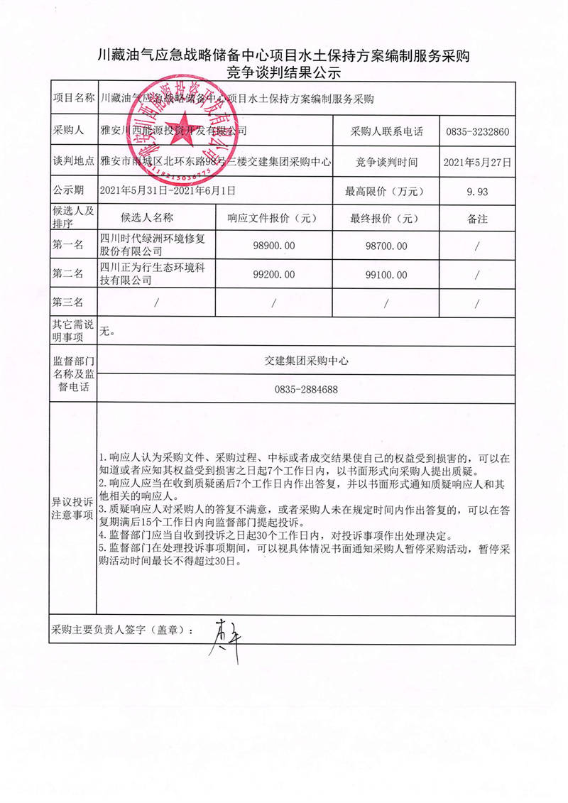 雅安川西能源投資開發(fā)有限公司川藏油氣應(yīng)急戰(zhàn)略儲備中心項目水土保持方案編制服務(wù)采購競爭談判結(jié)果公示