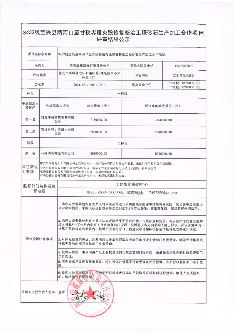 四川康藏路橋有限責任公司S432線寶興縣兩河口至甘孜界段災毀修復整治工程砂石生產(chǎn)加工合作項目評審結(jié)果公示