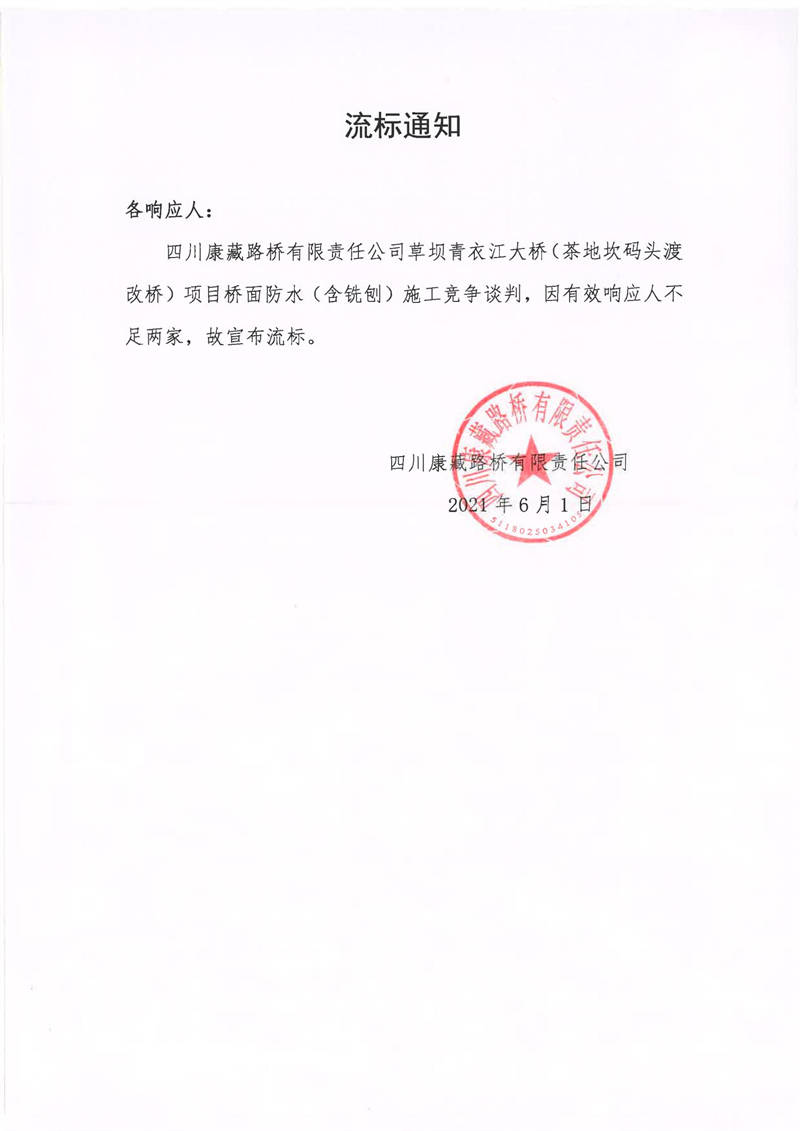 四川康藏路橋有限責(zé)任公司草壩青衣江大橋(茶地坎碼頭渡改橋)項(xiàng)目橋面防水(含銑刨)施工競(jìng)爭(zhēng)談判流標(biāo)通知