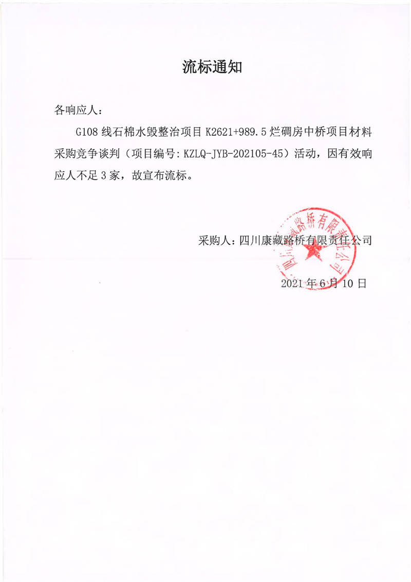 四川康藏路橋有限責(zé)任公司G108線石棉水毀整治項目K2621+989.5爛碉房中橋項目材料采購競爭談判流標(biāo)通知