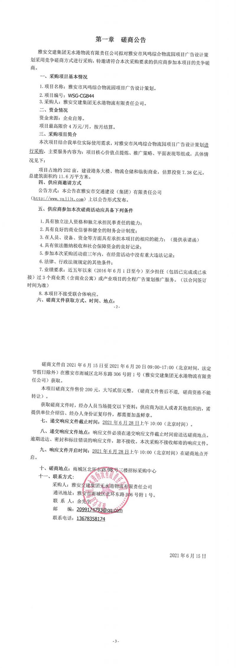 雅安交建集團無水港物流有限責任公司雅安市鳳鳴綜合物流園項目廣告設(shè)計策劃磋商公告