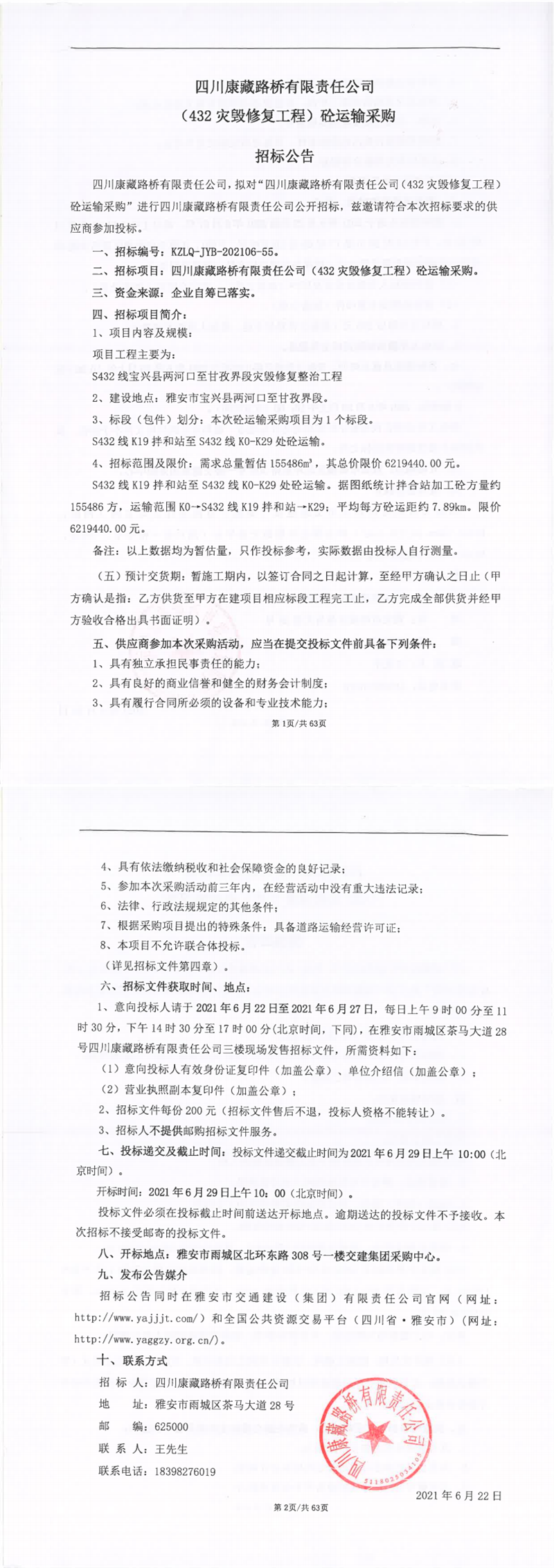 四川康藏路橋有限責(zé)任公司(432災(zāi)毀修復(fù)工程)砼運(yùn)輸采購招標(biāo)公告