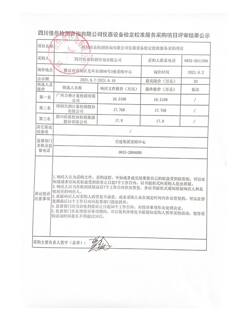 四川佳岳檢測咨詢有限公司儀器設(shè)備檢定校準(zhǔn)服務(wù)采購項(xiàng)目評(píng)審結(jié)果公示