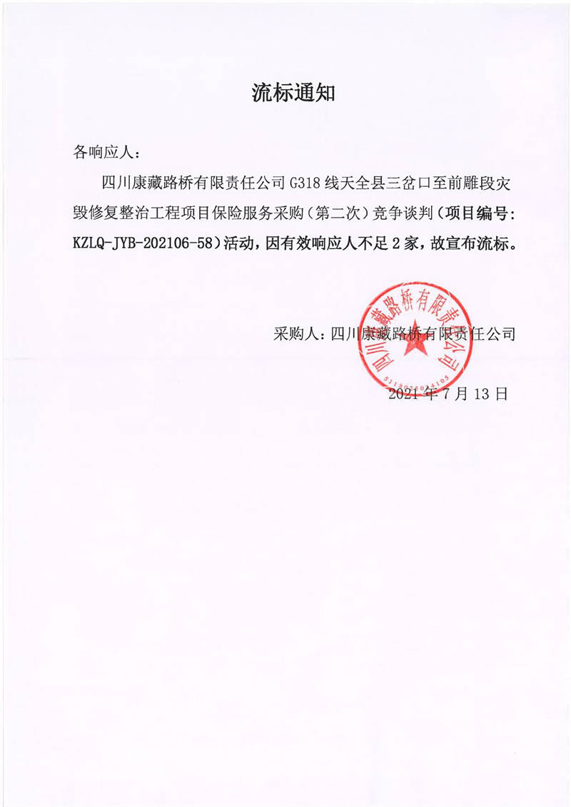 四川康藏路橋有限責(zé)任公司G318線天全縣三岔口至前雕段災(zāi)毀修復(fù)整治工程項(xiàng)目保險(xiǎn)服務(wù)采購(第二次)流標(biāo)通知