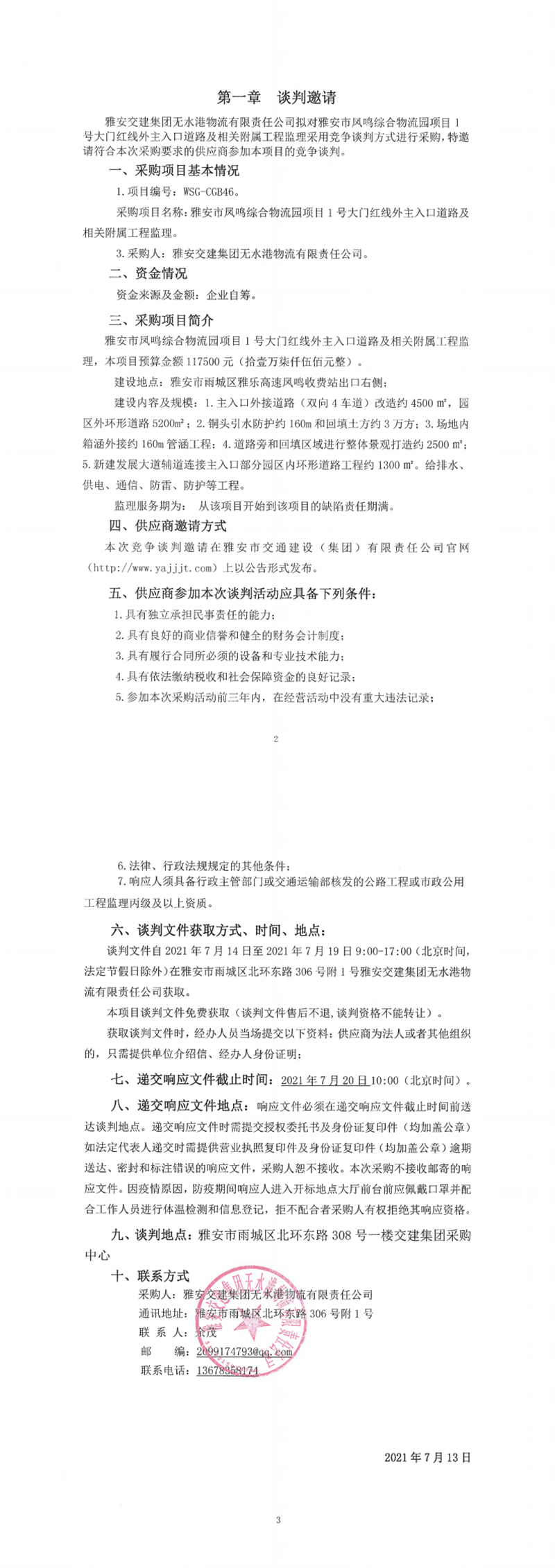 雅安交建集團無水港物流有限責(zé)任公司雅安市鳳鳴綜合物流園項目1號大門紅線外主入口道路及相關(guān)附屬工程監(jiān)理競爭談判公告