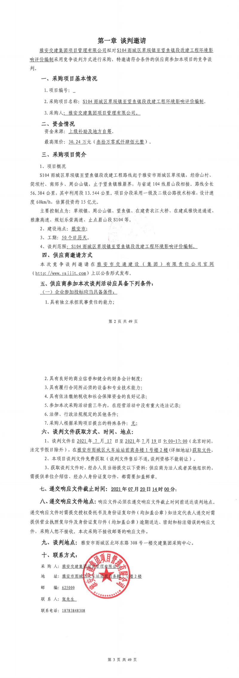 雅安交建集團(tuán)項(xiàng)目管理有限公司S104雨城區(qū)草壩鎮(zhèn)至望魚段改建工程環(huán)境影響評(píng)價(jià)編制競(jìng)爭(zhēng)談判公告