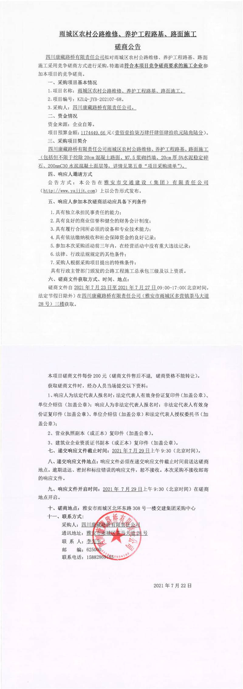 四川康藏路橋有限責(zé)任公司雨城區(qū)農(nóng)村公路維修、養(yǎng)護工程路基、路面施工磋商公告