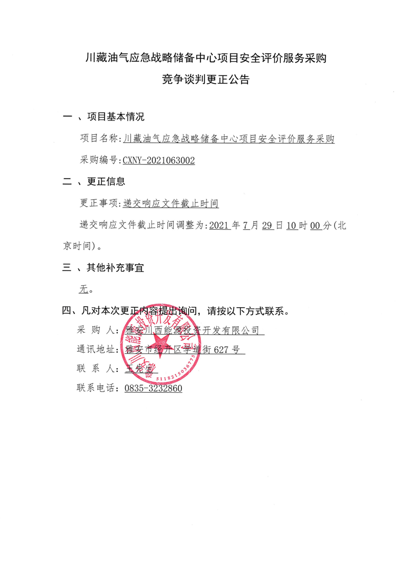 雅安川西能源投資開發(fā)有限公司川藏油氣應(yīng)急戰(zhàn)略儲(chǔ)備中心項(xiàng)目安全評(píng)價(jià)服務(wù)采購(gòu)競(jìng)爭(zhēng)談判更正公告