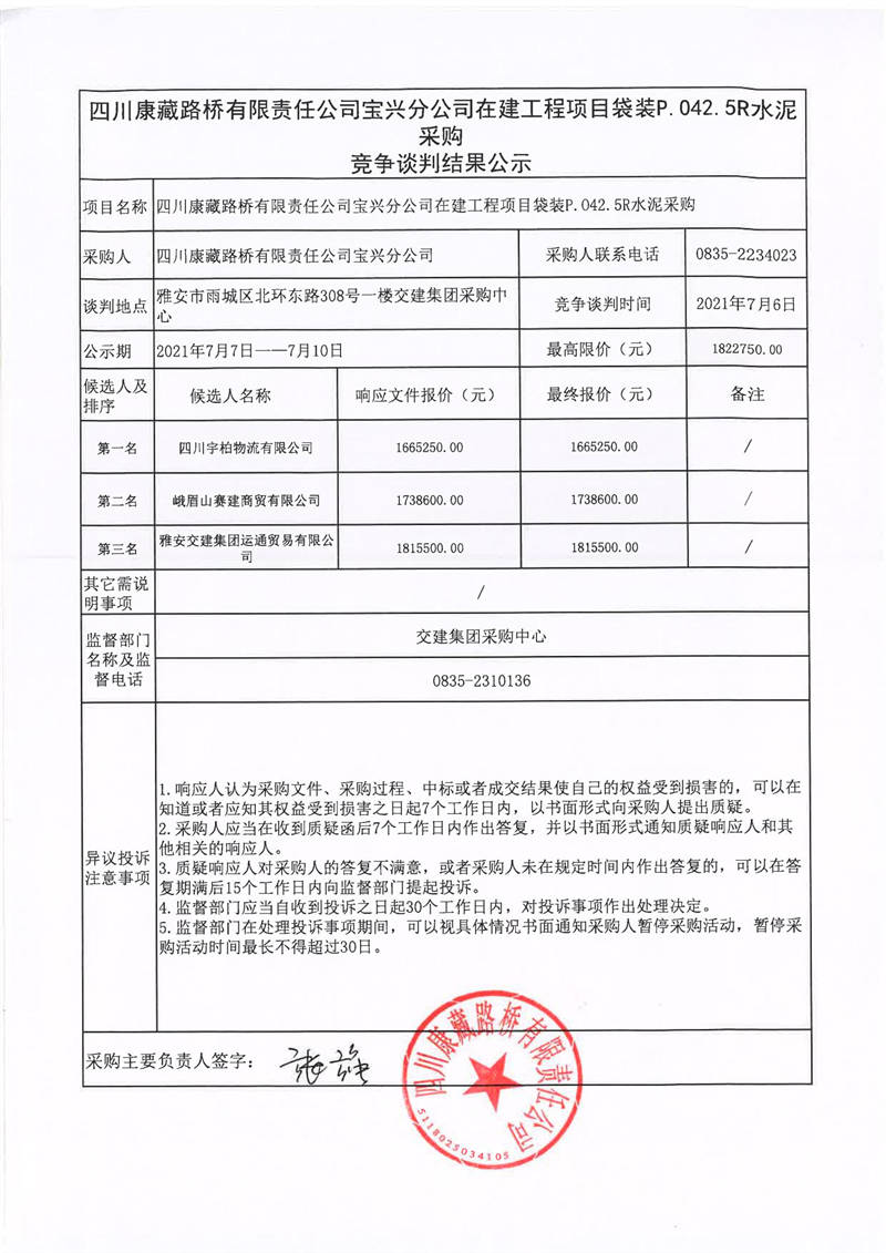 四川康藏路橋有限責(zé)任公司寶興分公司在建工程項目袋裝P.042.5R水泥采購競爭談判結(jié)果公示