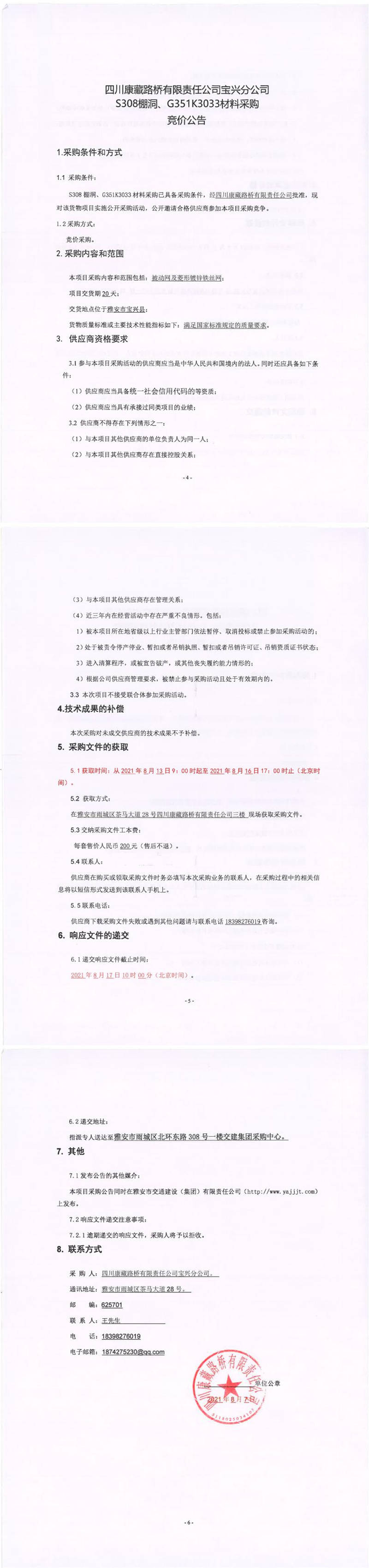 四川康藏路橋有限責(zé)任公司寶興分公司S308棚洞、G351K3033材料采購(gòu)競(jìng)價(jià)公告