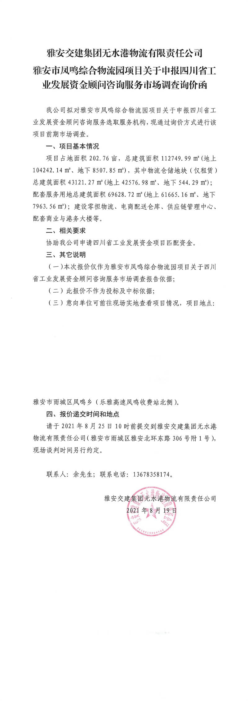 雅安交建集團(tuán)無水港物流有限責(zé)任公司雅安市鳳鳴綜合物流園項(xiàng)目關(guān)于申報(bào)四川省工業(yè)發(fā)展資金顧問咨詢服務(wù)市場(chǎng)調(diào)查詢價(jià)函