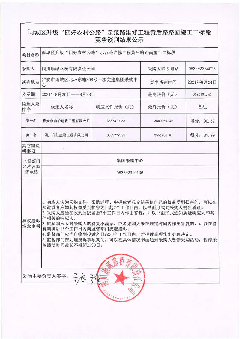 四川康藏路橋有限責(zé)任公司雨城區(qū)升級“四好農(nóng)材公路”示范路維修工程黃后路路面施工二標(biāo)段競爭談判結(jié)果公示