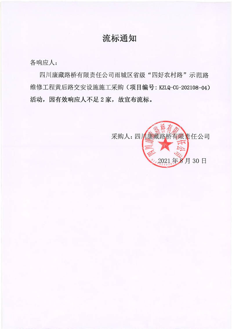 四川康藏路橋有限責任公司雨城區(qū)省級“四好農(nóng)村路”示范路維修工程黃后路交安設(shè)施施工采購流標通知