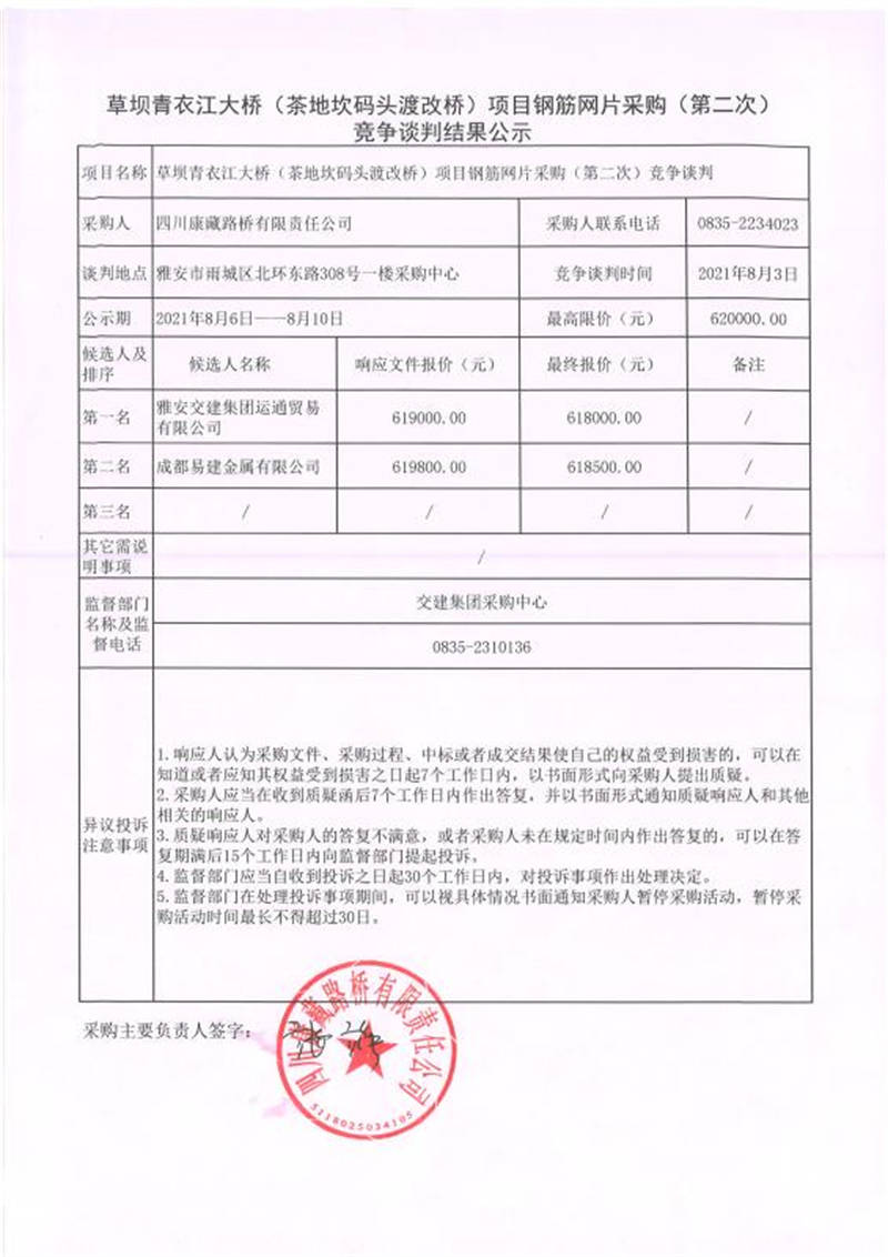 四川康藏路橋有限責(zé)任公司草壩青衣江(茶地坎碼頭渡改橋)項(xiàng)目鋼筋片采購競爭談判結(jié)果公示