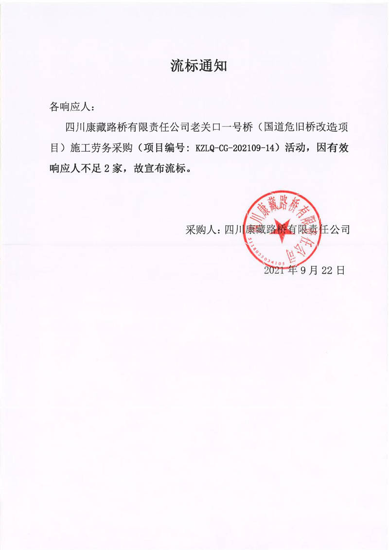 四川康藏路橋有限責(zé)任公司老關(guān)口一號(hào)橋(國(guó)道危舊橋改造項(xiàng)目)施工勞務(wù)采購(gòu)流標(biāo)通知